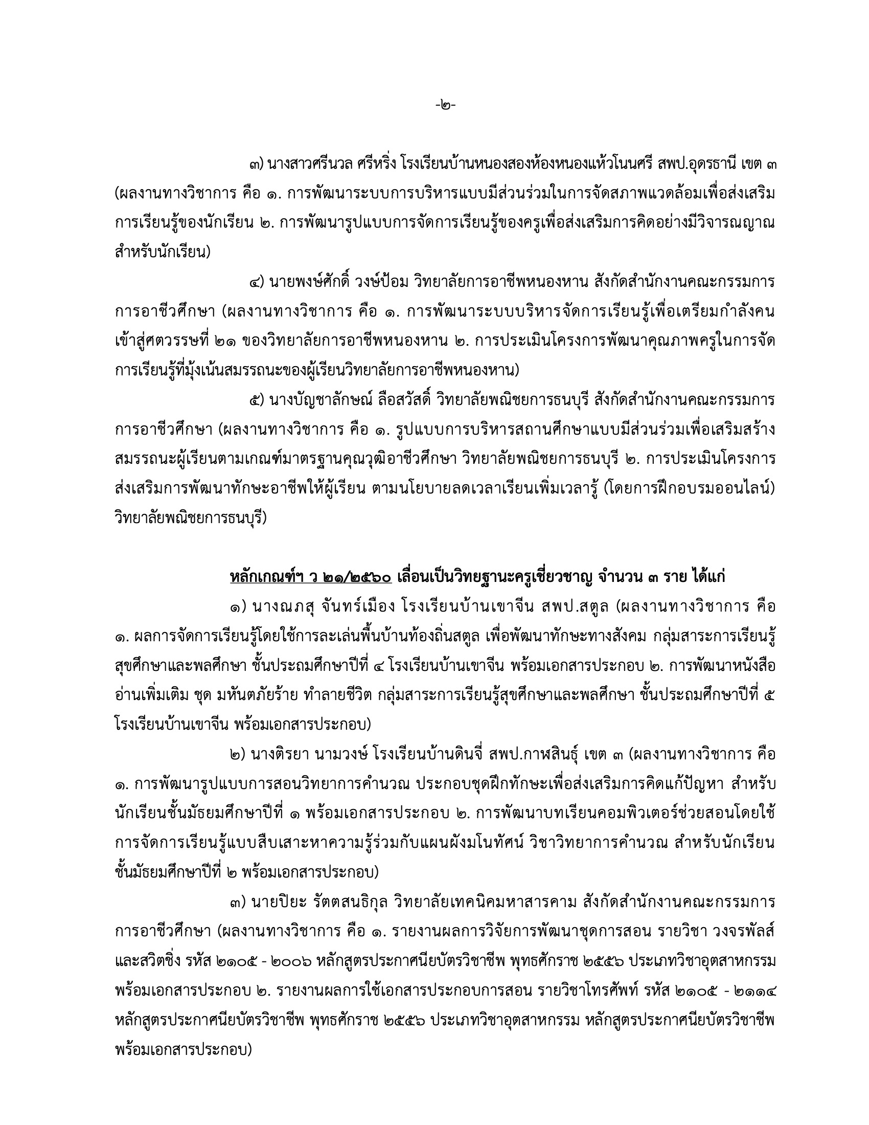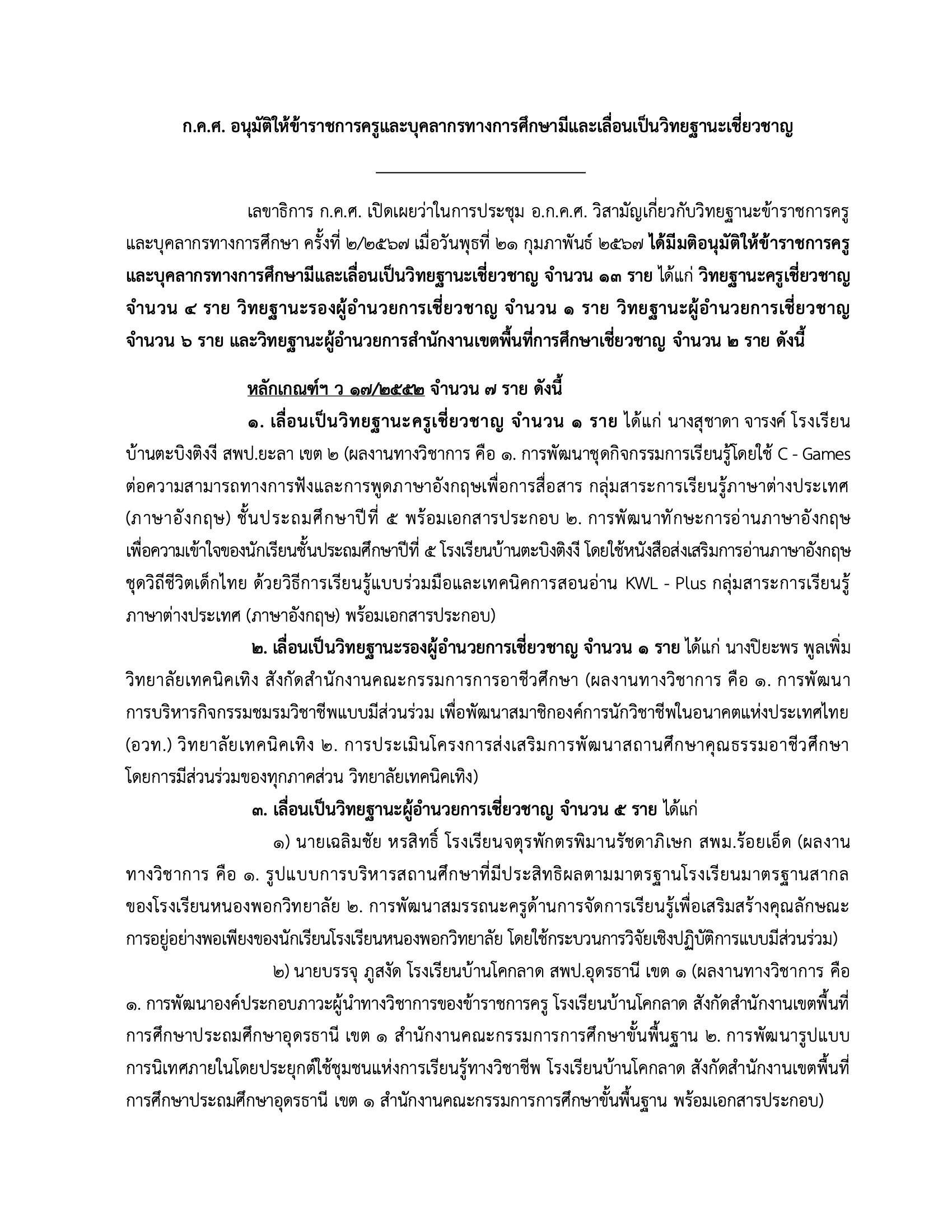 | เลขาธิการก.ค.ศ.เปิดเผยว่าในการประชุมอ.ก.ค.ศ.วิสามัญเกี่ยวกับวิทยฐานะข้าราชการครู และบุคลากรทางการศึกษาครั้งที่ ๒/๒๕๖๗ เมื่อวันพุธที่ ๒๑ กุมภาพันธ์ ๒๕๖๗ ได้มีมติอนุมัติให้ข้าราชการครู และบุคลากรทางการศึกษามีและเลื่อนเป็นวิทยฐานะเชี่ยวชาญจำนวน ๑๓ ราย ได้แก่